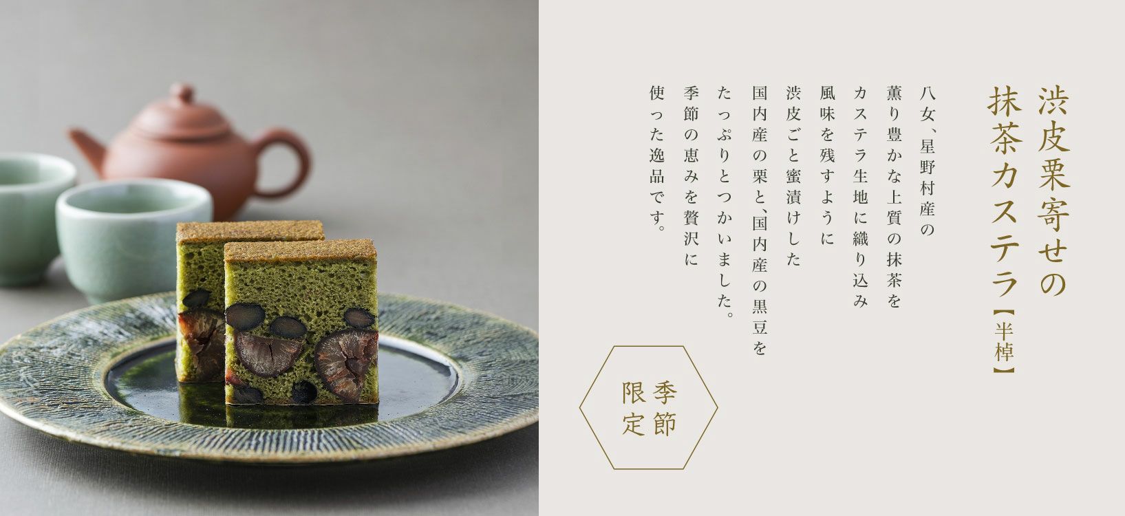 寒暖の差が大きく、抹茶の栽培に適した奥八女、星野村産の薫り豊かな抹茶を使い、国内産の渋皮栗と国内産の黒豆を惜しみなく、たっぷりと使いました。