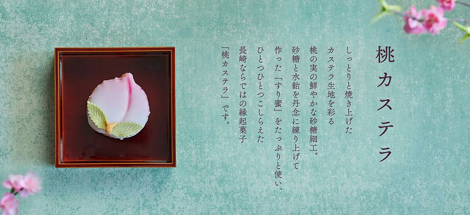 松翁軒の桃カステラは出産祝いや節句などに作る桃の実を模した縁起菓子です。カステラは南蛮船の渡来で外国との貿易が許されたころに伝来しました。桃カステラはまさにそのころのスペイン・ポルトガルや中国の文化を折衷した異国の香りが漂う、長崎らしい、一種独特の感じを持っている甘味です。