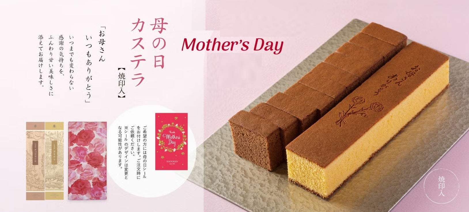 焼印を入れた「母の日」の特別なカステラと、明治時代より伝わる しっとりと濃厚な味わいのチョコラーテの詰め合わせ。