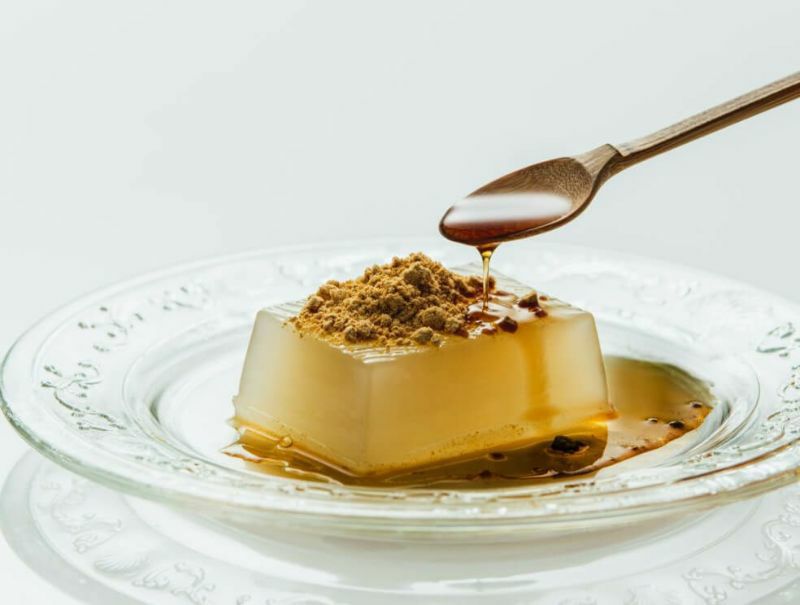 ◎葛の花々(かずらのはな)/職人が窯に付ききりで時間をかけて練った、もっちりとしたくず餅です。添え付けのきな粉、黒蜜を少量ずつ絡ませて、お好みの甘さ加減でお召し上がりください。