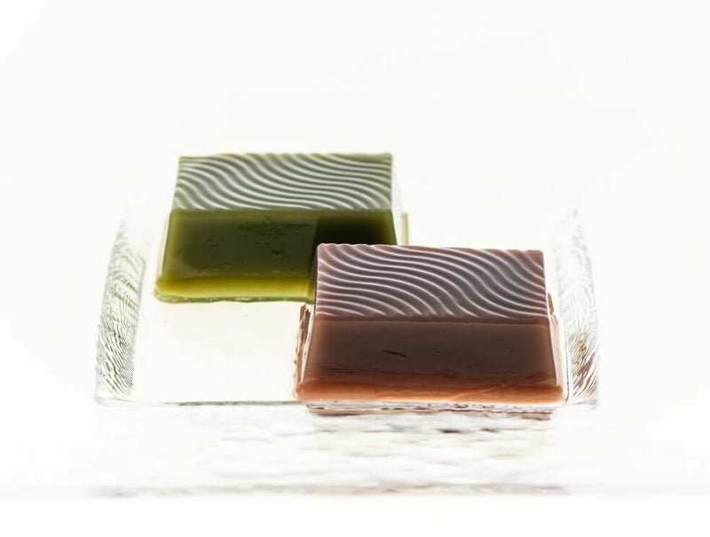 ◎水羊羹/淡くなめらかな口どけ、瑞々しい甘さと小豆の香りが引きたつ北海道産小豆を使用した【こし餡】、馥郁と爽やかな香りが涼を呼ぶお茶の産地 八女星野村産 抹茶を使用した【抹茶】