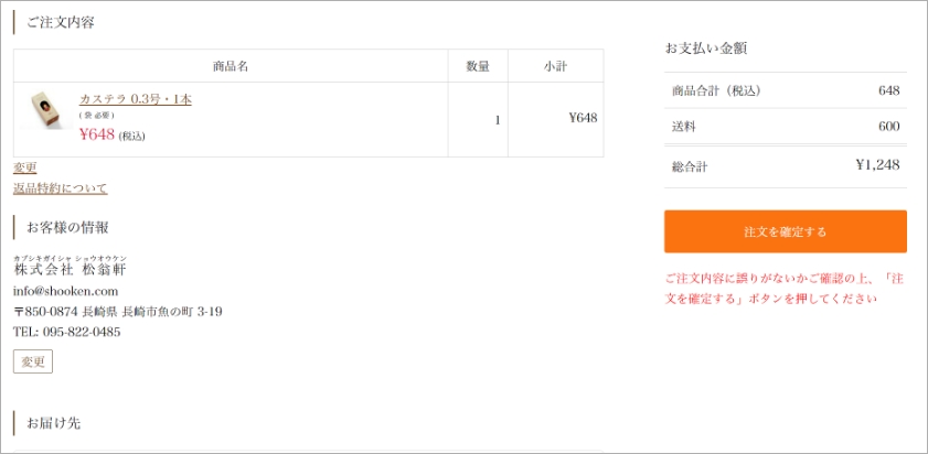 [注文を確定する]を押した場合、手続きがすべて完了するため内容やお届け先に誤りがないかご注意ください。