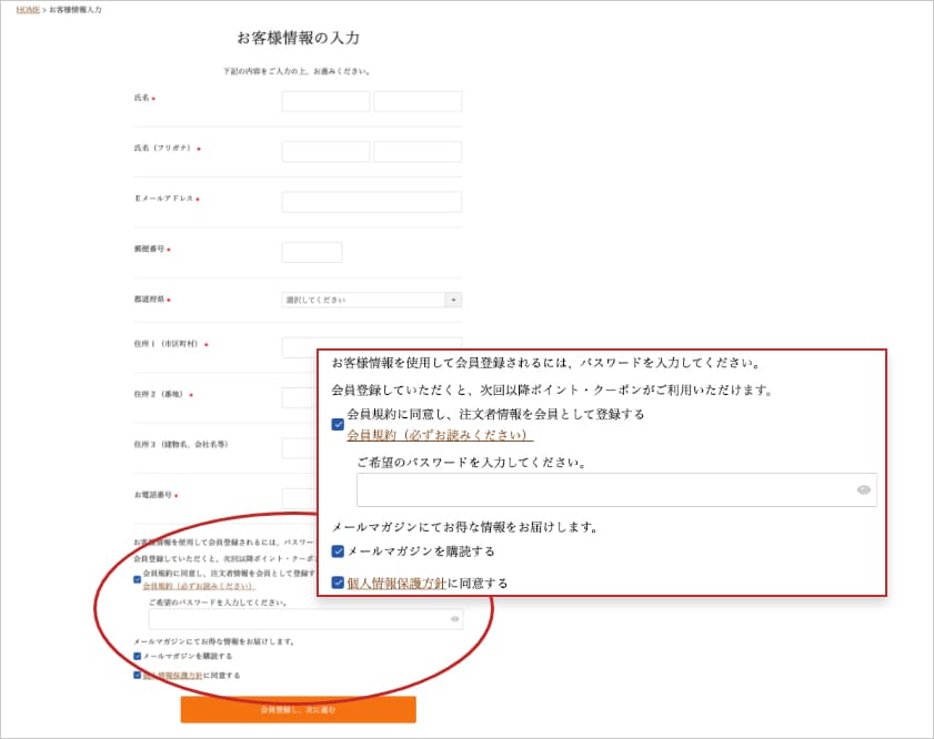 そのまま会員登録をされる方は、[会員規約に同意]の欄にチェックを入れていただき、ログイン時に必要なパスワードを入力してください。ログインIDはご入力いただいたEメールアドレスとなります。
