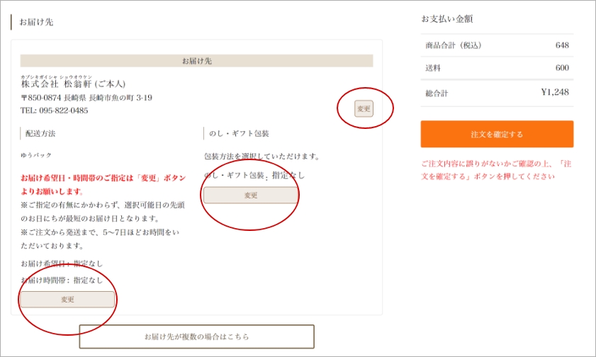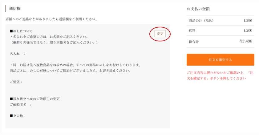 お届け日時やのし・ギフト包装の設定は、各項目の[変更]をクリックし、ご変更いただけます。