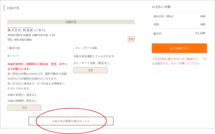 お届け先が2件以上ある場合は[お届け先が複数の場合はこちら]をクリックすると複数のお届け先を入力できます。