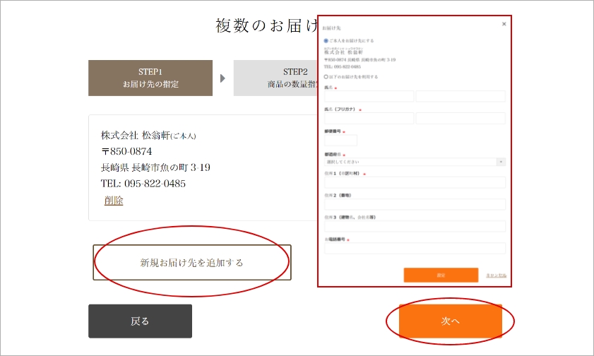 [新規お届け先を追加する]をクリック後、[以下のお届け先を利用する]にチェックいただきご入力ください。