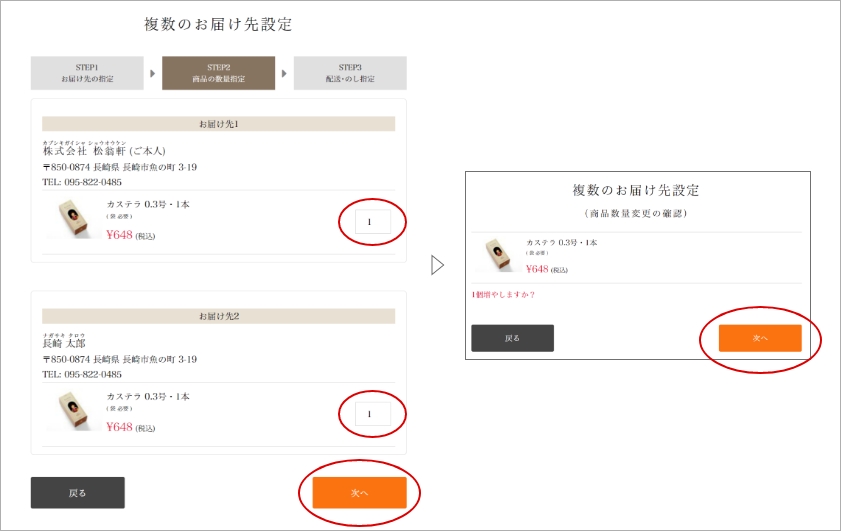 お届け先ごとにお届けする商品の数量を指定し、[次へ]をクリックしてください。